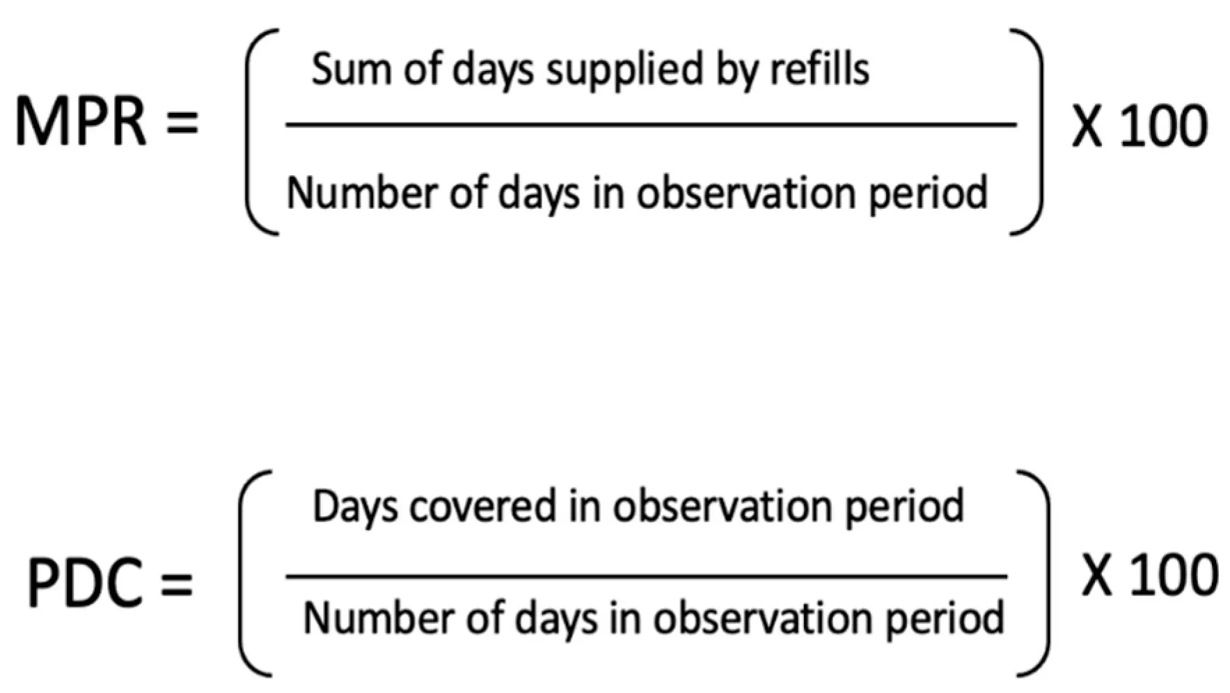 It is essential to recognize, however, that these metrics primarily measure refill compliance, rather than actual medication adherence. The MPR is the sum of the days’ supply for all fills of a given drug over a particular time period, divided by the number of days in that time period. The PDC is the number of days “covered” with prescribed medication over a period of time, divided by the number of days in that time period. While they both offer some insights into whether patients have received their prescribed medications, they do not reflect whether patients are actively taking them.