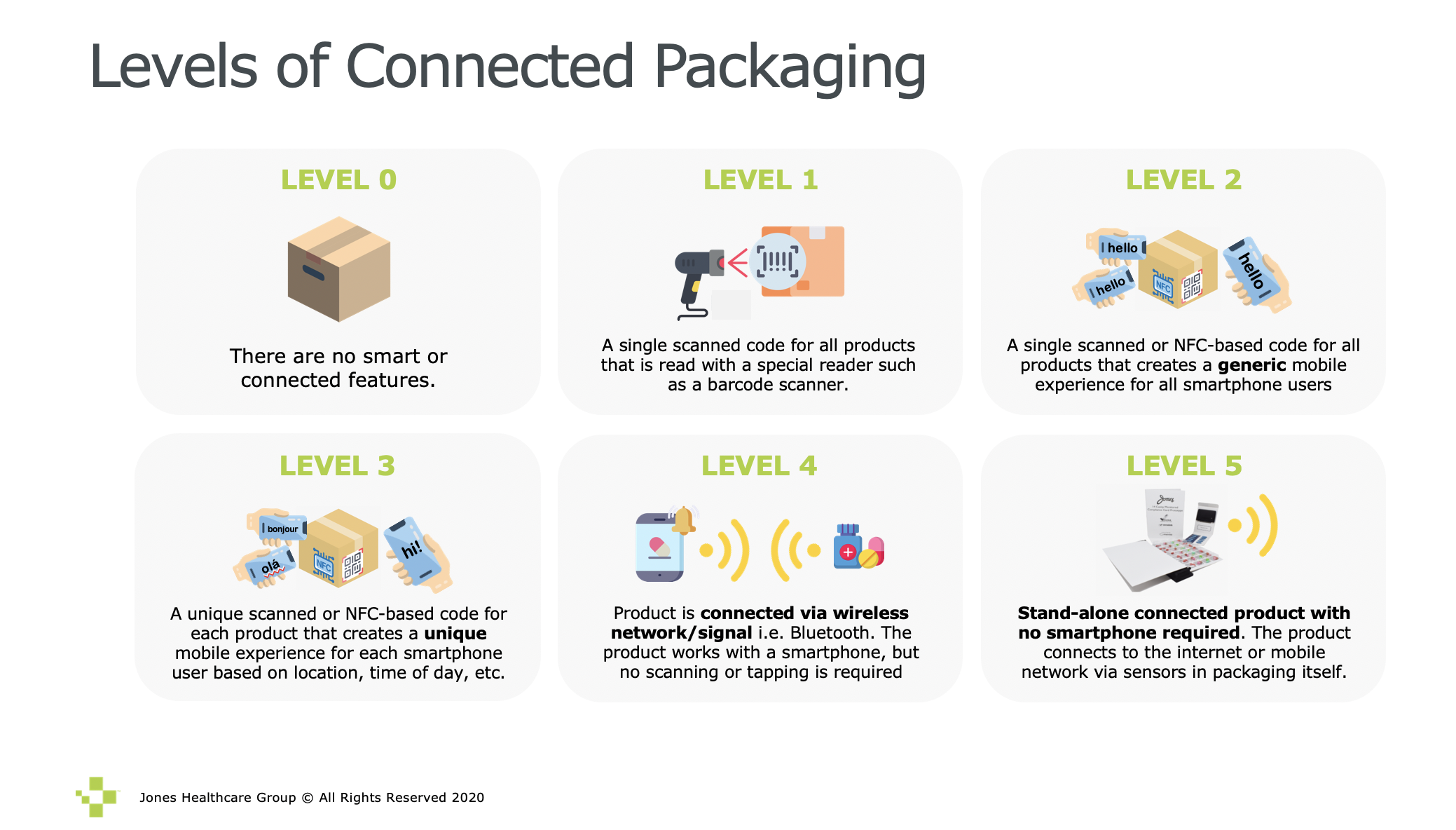 It’s not a level playing field in packaging—connectivity in Levels 3-5 turns a box or carton into an Internet of Things device. Image courtesy Jones Healthcare Group.